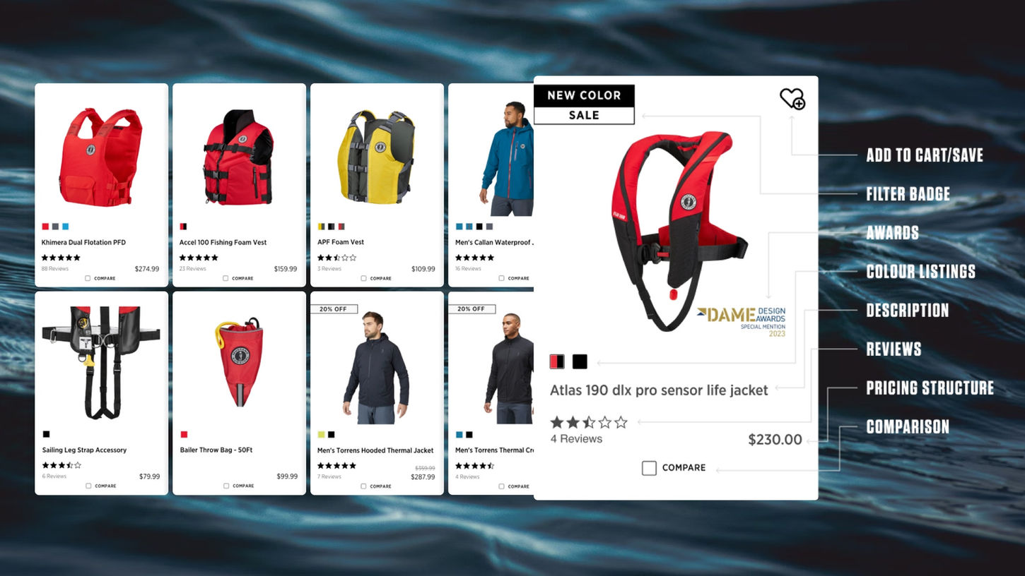 So we charted a course to streamline the shopping experience, drive conversions, and enhance product discoverability—all while maintaining Mustang Survival’s high-performance brand identity.